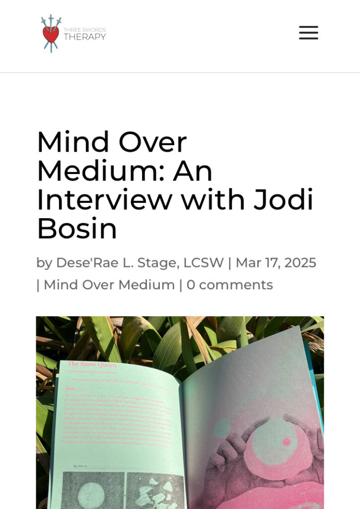 stuff I do / me in the news Des interviewed me on her therapy blog!https://threeswordstherapy.com/2025/03/17/mind-over-medium-an-interview-with-jodi-bosin/In which I talk about the difference (or lack thereof) between mental health and life I play drums in triple black diamond [@clubtbd] I did an aerial show once and maybe will again once day if I am brave enough –