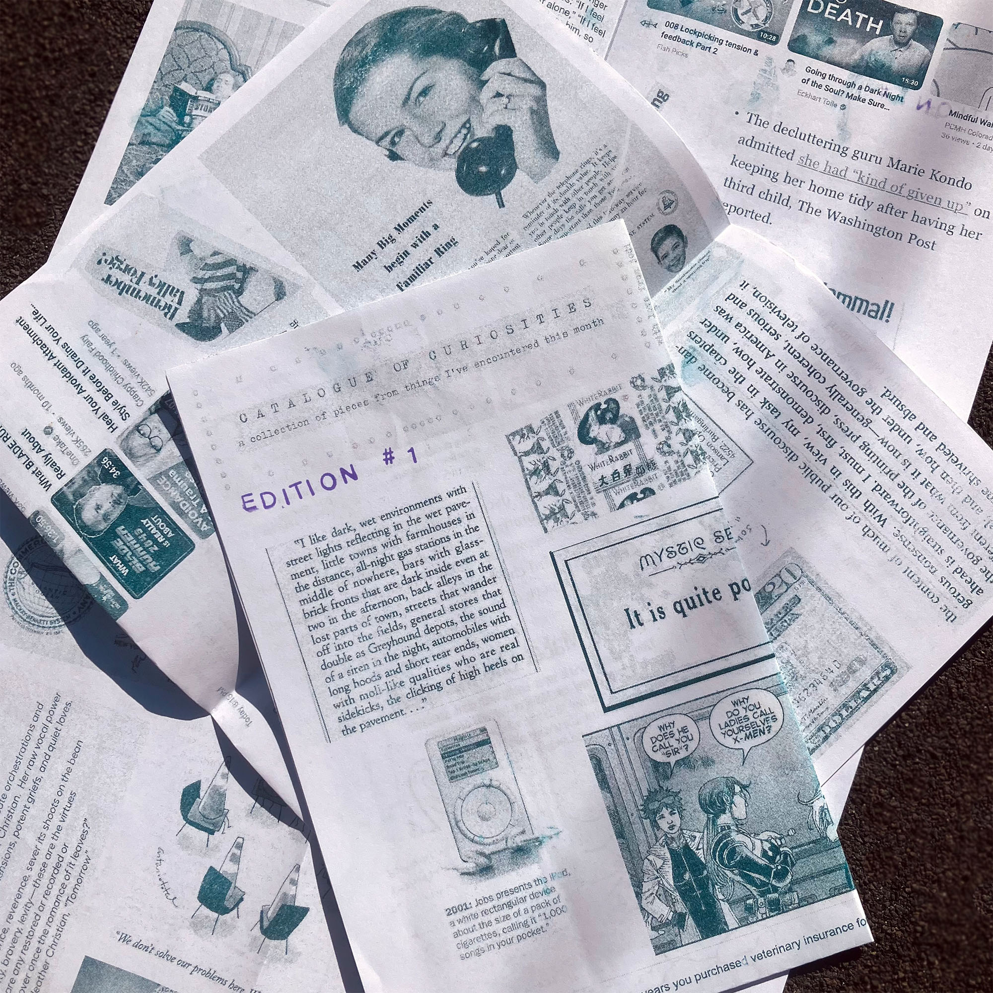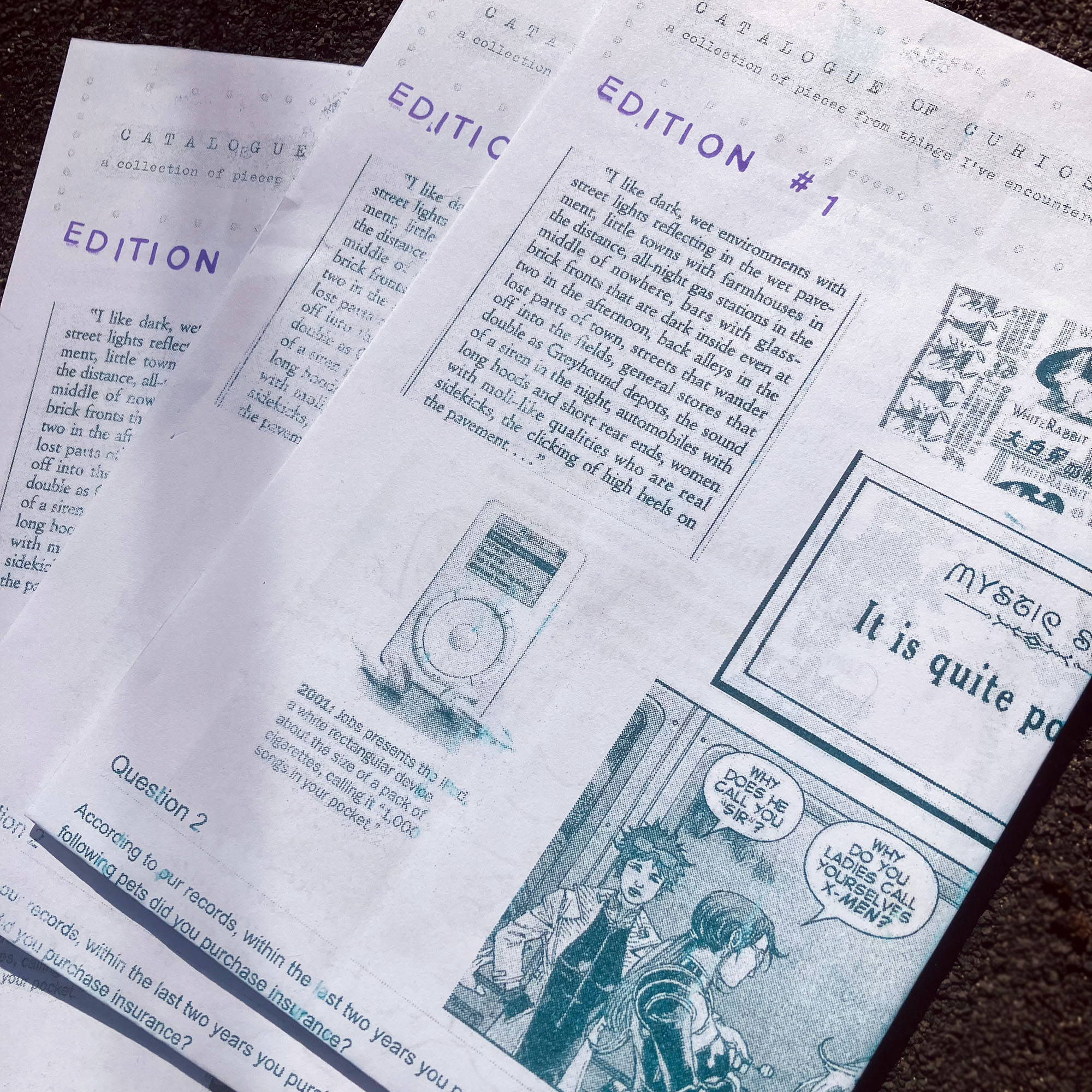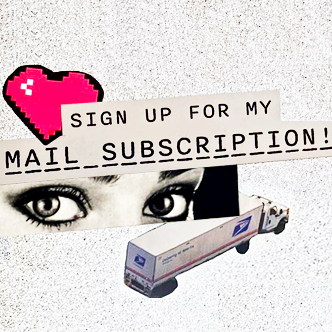 If you love to recieve quirky and/or thought provoking art ephemera in the mail, this is for you! I will mail you a monthly newsletter of sorts along with prints, zines, or other miscellany. $4 for one month or $48 for the whole year.